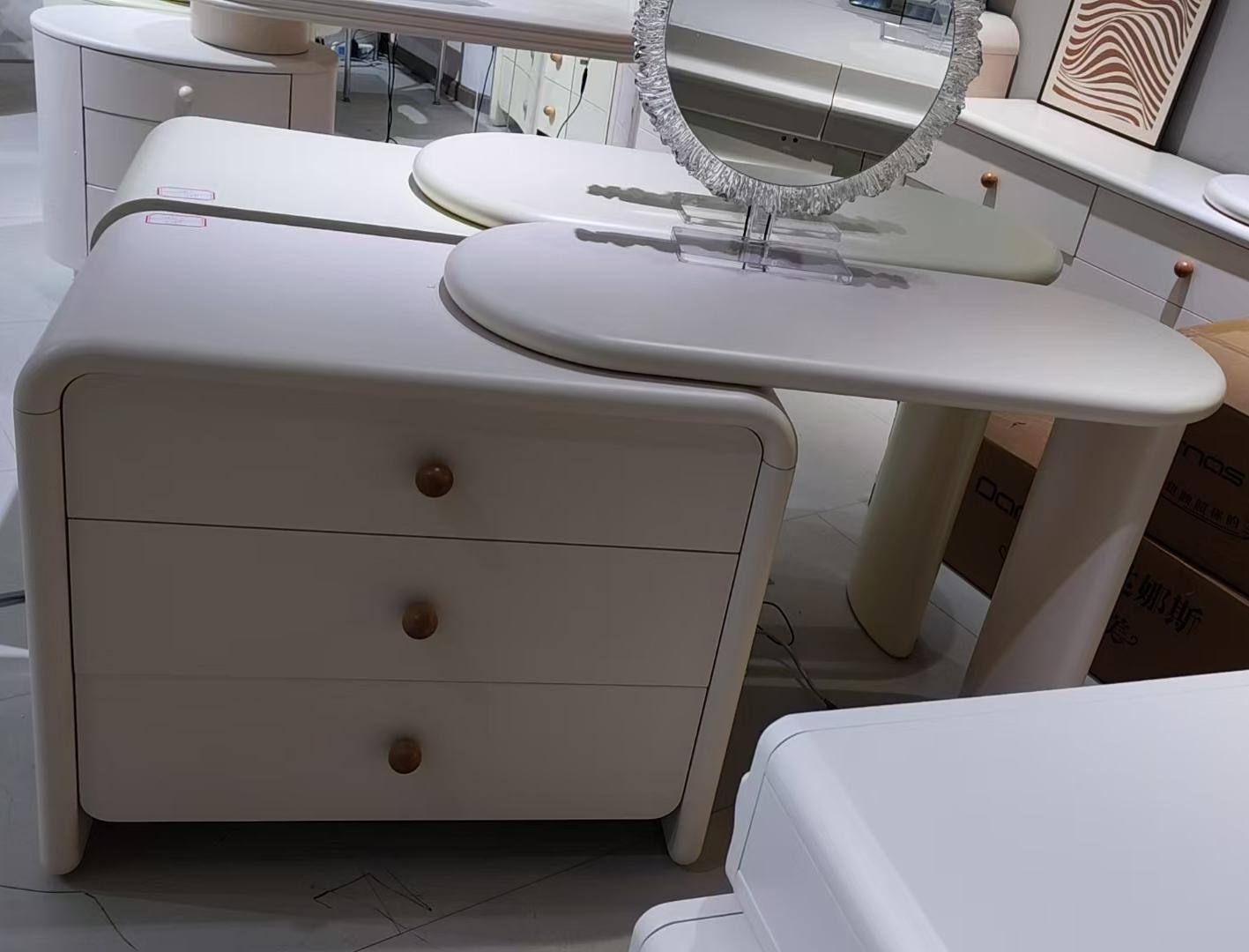 Embrace a soft, modern elegance with the Cloud Curve Vanity Desk. Featuring rounded edges, a matte ivory finish, and a gracefully curved tabletop, this design adds warmth and calm to any bedroom or dressing corner. The three spacious drawers keep your essentials neatly tucked away, while the open leg design offers a light and airy feel. Pair it with your favorite chair and create a cozy beauty space that feels uniquely yours.